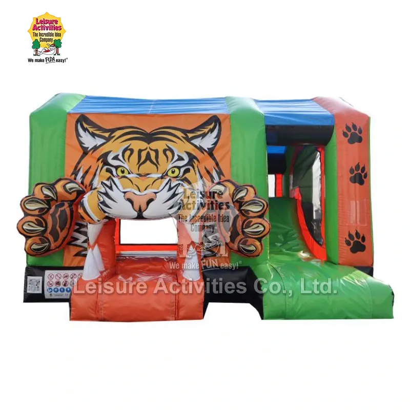 Leisure Activities® یک تولید کننده و تامین کننده حرفه ای محصولات بادی در چین است. قلعه‌های بادی چند‌بازی ببر Bouncy Standard یک قلعه بادی با تم ببر است که ویژگی‌های پرش، بالا رفتن و سر خوردن را ترکیب می‌کند. این رنگ سبز لیمویی و نارنجی را به عنوان رنگ‌های اصلی با دکوراسیون ببری سه بعدی در ورودی نشان می‌دهد. می توان آن را به سرعت در عرض 10 دقیقه راه اندازی کرد.